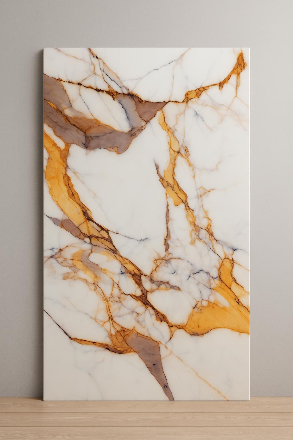 חיפוי קיר יוקרתי במראה שיש לבן מבריק עם עורקים זהובים ונחושתיים המשווה לחלל תחושת יוקרה ואלגנטיות מודרנית .