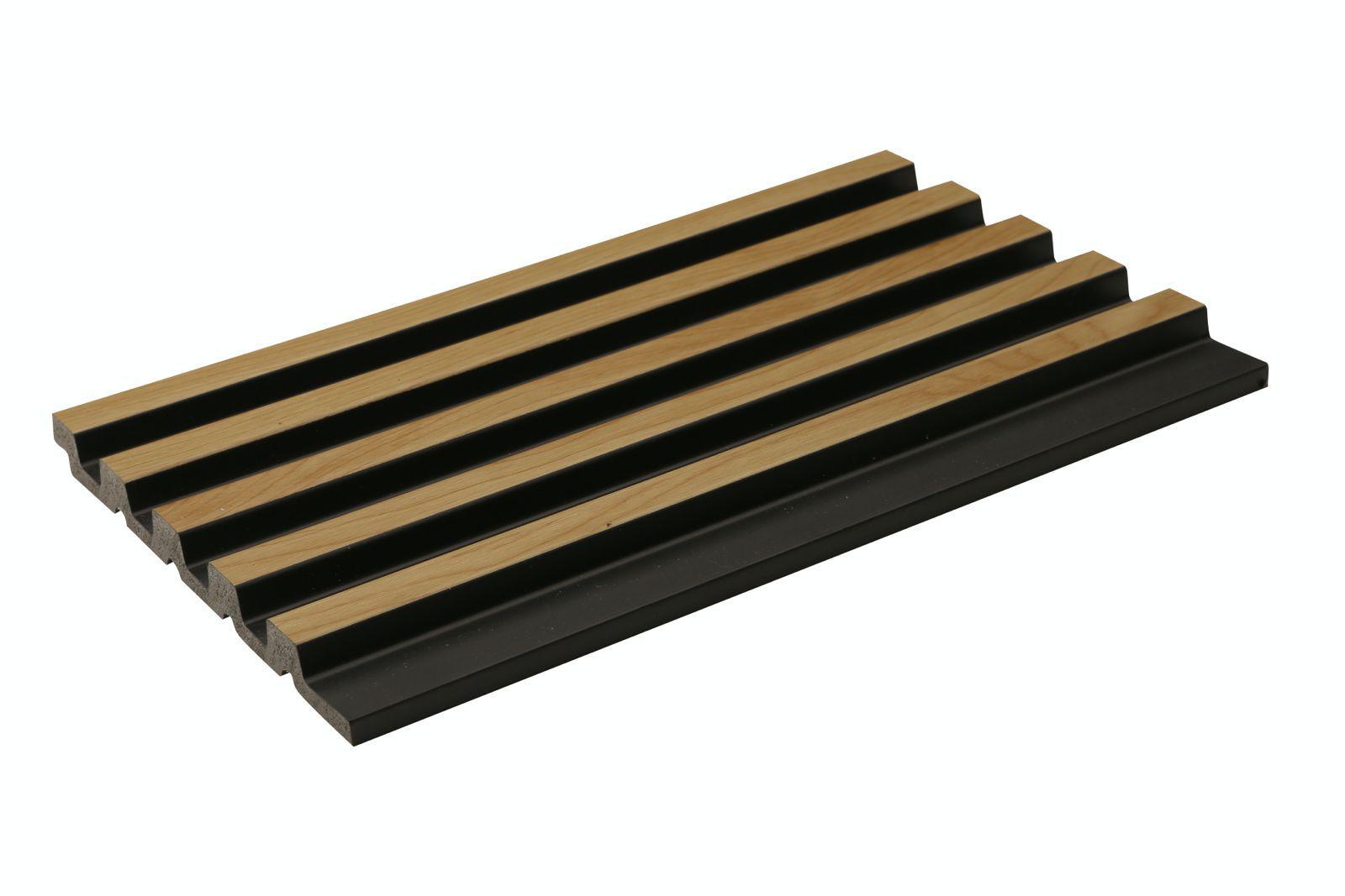 חיפוי קווים בגוון עץ טבעי, רווחים צפופים, בסיס שחור.